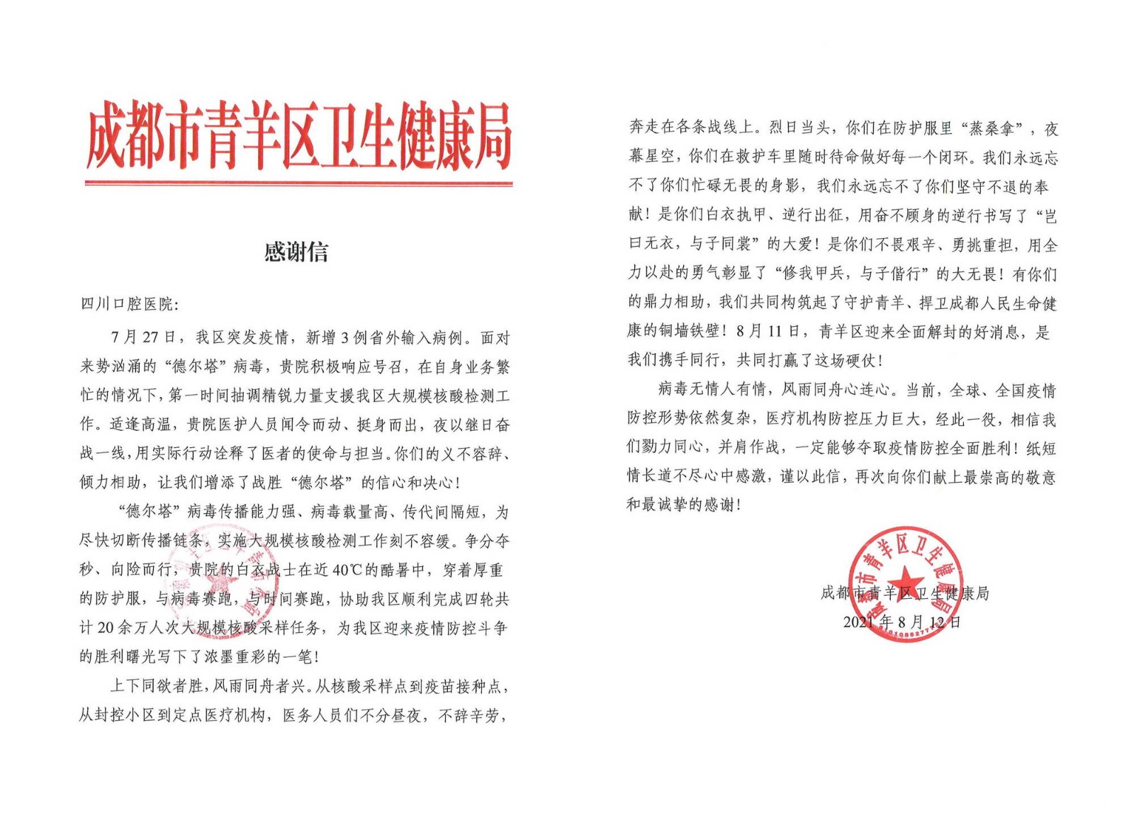 四川口腔醫(yī)院收到區(qū)衛(wèi)生健康局的感謝信