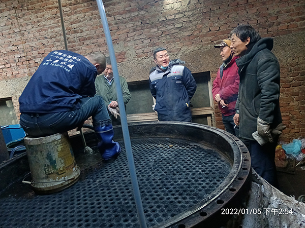 2022年1月24日星期一,虎年(農(nóng)歷臘月二十二)大寒季節(jié),室外時溫零下—16℃,遼寧省彰武縣興隆山鄉(xiāng)老虎坨子村,阜新市彰武縣達(dá)凱化工有限公司糠醛廠,在高經(jīng)理的精心安排下,蘇振山廠長給我們指導(dǎo),積極與我們河南都市機(jī)械設(shè)備有限公司喬俊陽技術(shù)員配合,改制了一款寬槽橡膠滑輪,對結(jié)垢堅(jiān)硬,徹底燒干堵死的廢水蒸發(fā)器管子進(jìn)行疏通,清理,經(jīng)過實(shí)驗(yàn),既節(jié)省了人力,又安全,又快捷,確實(shí)是值得分享的好辦法!